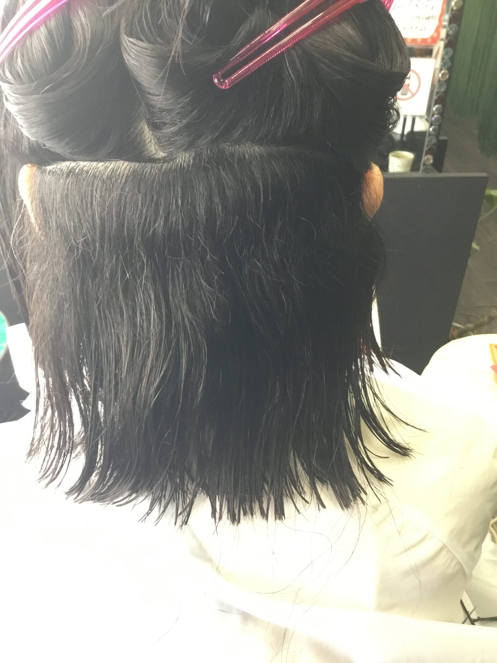 ↓ 肩上までカットするので、ほぼ毛先まで全頭をストレート処理していきます。内側はヨレが大きく、髪はやや太め、カラーの履歴がなく髪の健康状態は良好です。